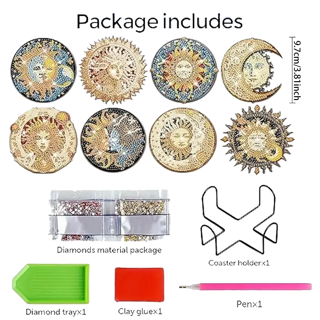 【Package Includes】Artificial Diamond Painting Coaster x 8, Coaster Holder x 1, Clay Glue x 1, Pen x 1, Diamond Tray x 1